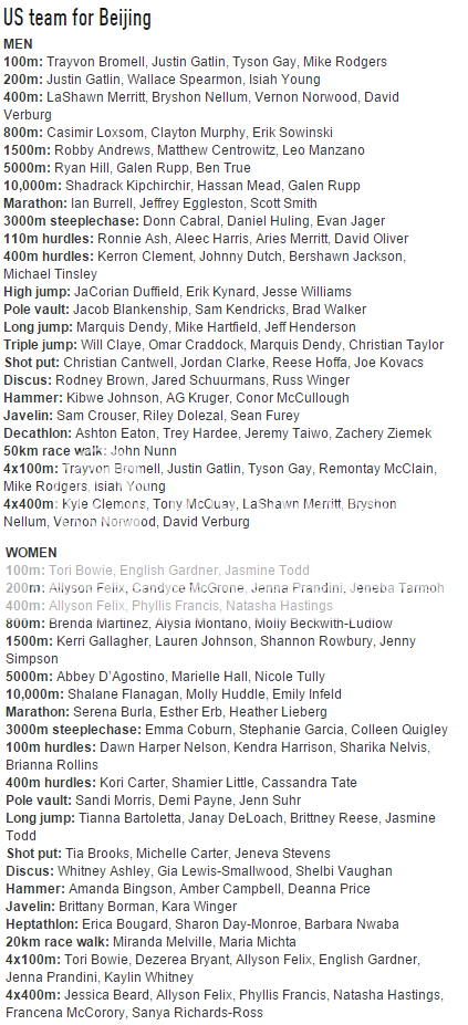 Họ vẫn giữ được đầy đủ 5 nhà vô địch cá nhân năm 2013 để tới Bắc Kinh năm nay, đó là Eaton 10 môn phối hợp, Merritt 400m nam, Oliver 110m rào nam, Reese nhảy xa nữ và Rollins 100m rào nữ